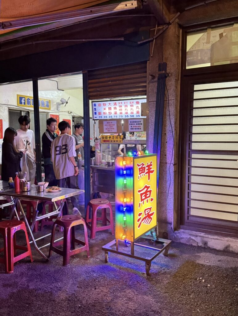 俞家清魚湯位於台灣基隆,是一家大概凌晨一點半左右開始營業的小店。我們到的時候才十一點多,老闆叫我們等一下再回來,她們還沒準備好。等我們一點多回來的時候門口已經排起了長龍,看來真的是很熱門了。我們開始排隊後,後面馬上又來了一群大學生。本該安靜的夜晚變得十分熱鬧,老闆不得不出來提醒好幾次叫大家小聲點,不然會吵到附近的居民。