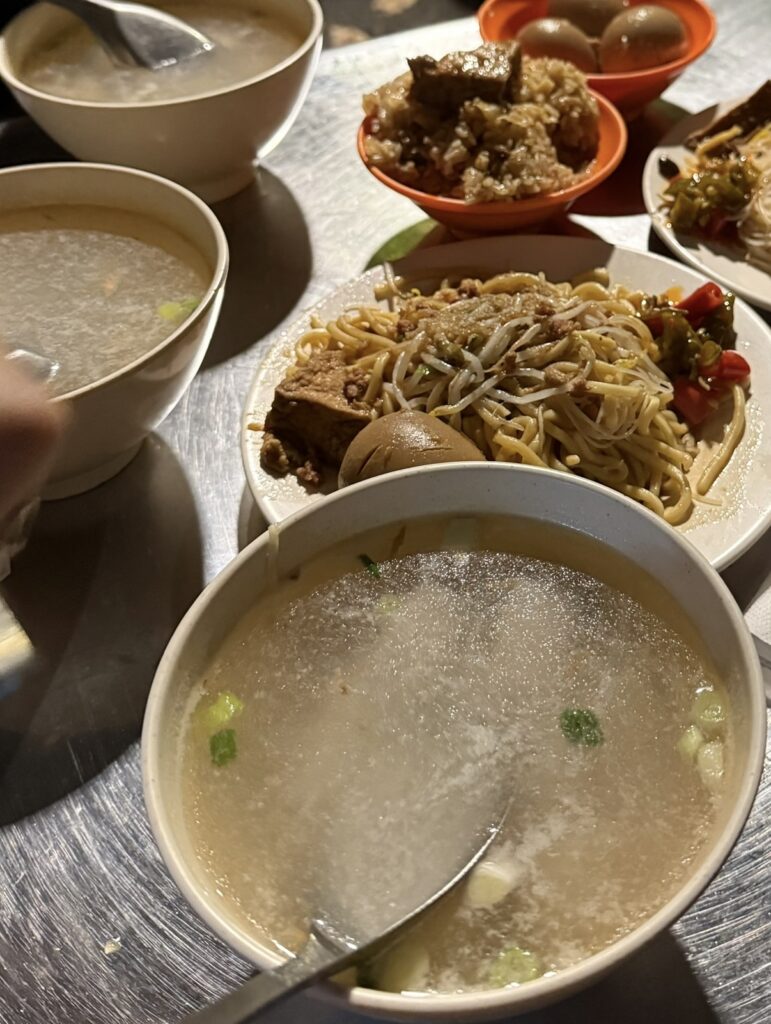 我們五個人一共點了一份油飯,一份炒米粉,一份大麵炒,五碗湯和五個滷蛋。我最愛吃的是油飯和魚湯。魚湯裡面有蔥花,薑絲和白色的魚塊,看起來平平無奇,非常普通,可是喝起來卻很驚艷,一點也不腥,反而很鮮美,姜味也被融合得很好。還有就是桌上配的小魚辣椒也很好吃。